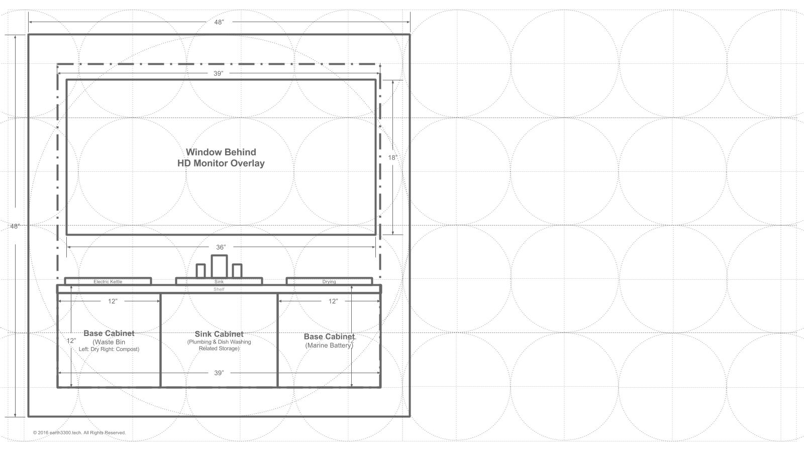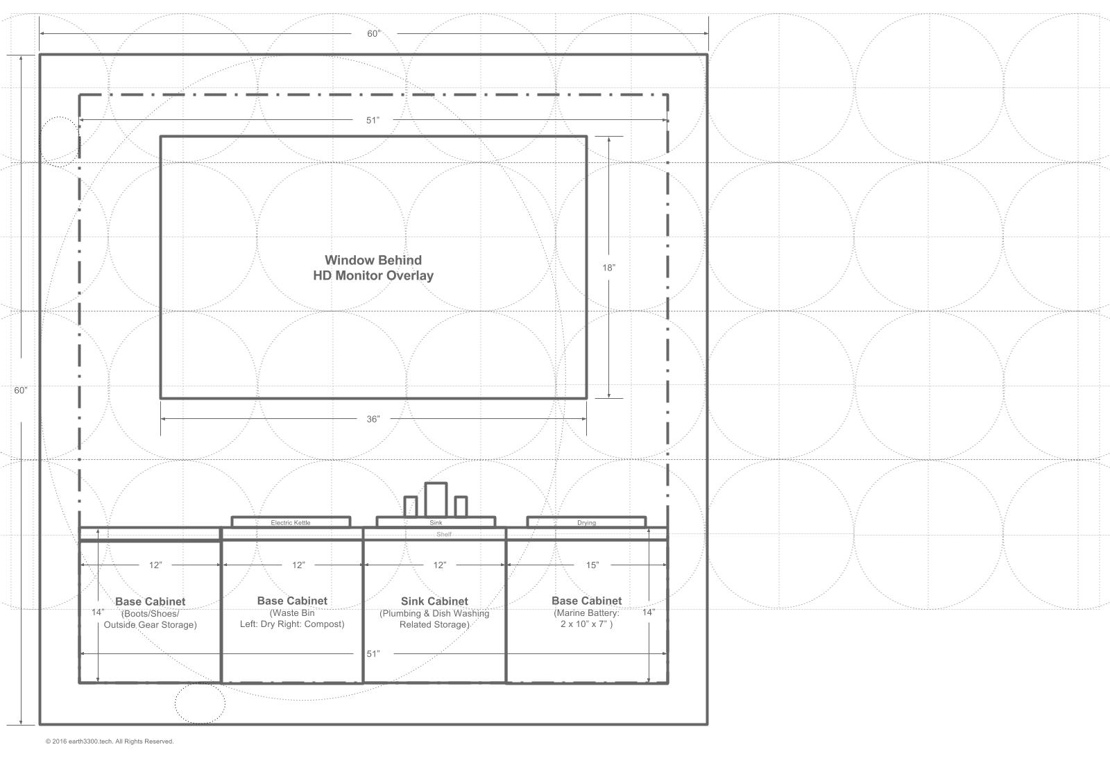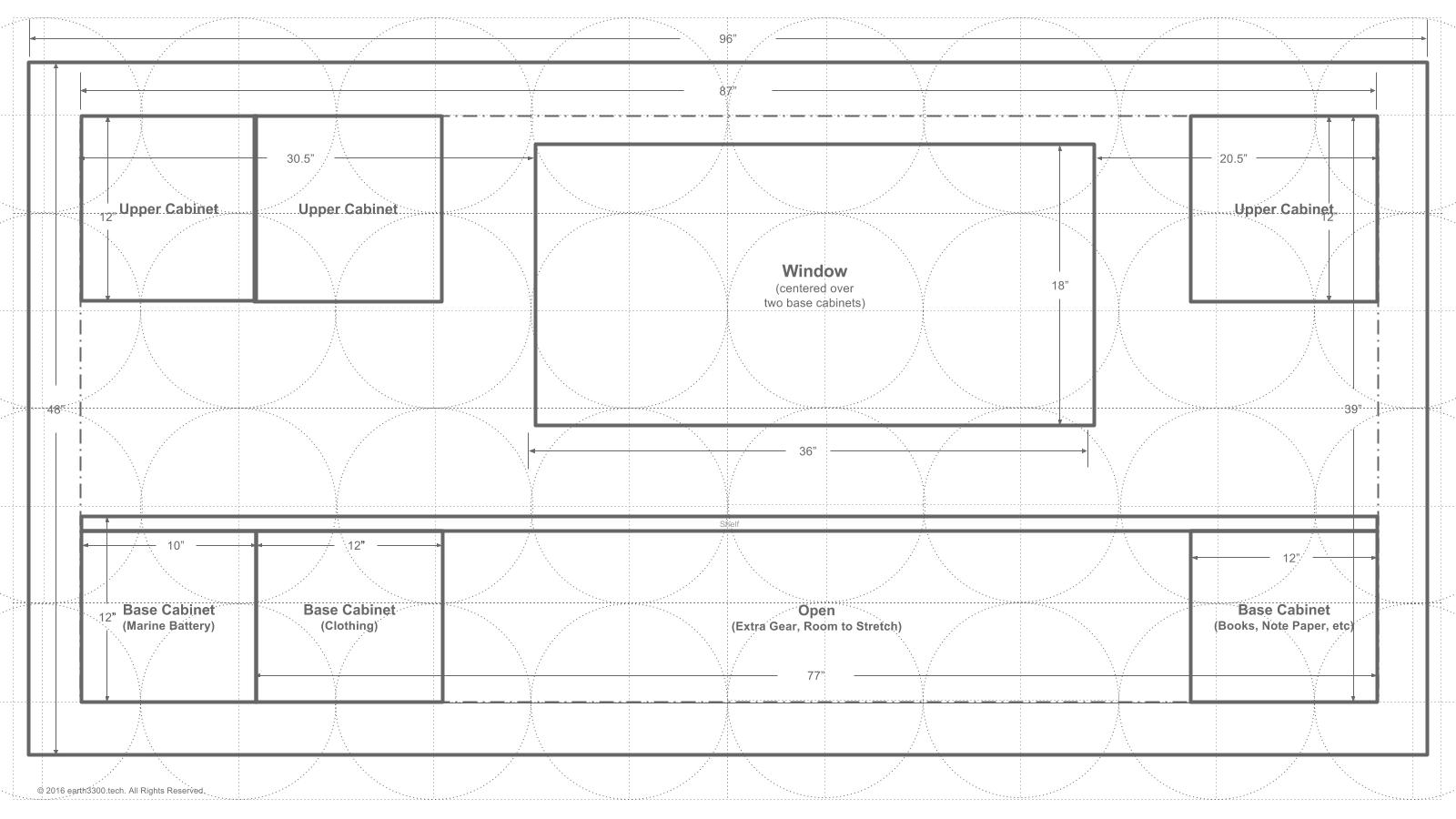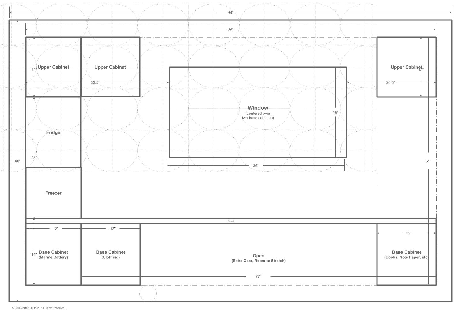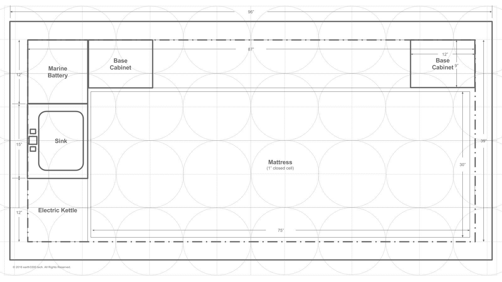 Here is a schematic of the floor plan after the initial one was designed. When talking through the initial plan it was realized that one would swing into the cabin and then want to remove boots or shoes when inside. These need to be stored somewhere. Also, to provide a degree of separation between the mattress area and the outside (to remove the mattress and sleeping bag or comforter from the outside elements), a "sitting ledge" would provide a nice transition point and allow the occupant to sit for a while on that ledge before getting up in the morning, or before settling down for the night.