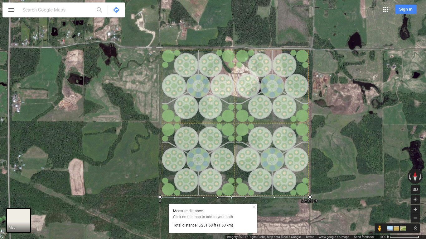 Alberta has seen its share of boom and bust. When I was in Calgary (in the mid '90s again), I noticed a well laid out city, an attractive university and a short hours drive to the mountain range and then nearby Banff. Absolutely stunning scenery. Just north is Edmonton and north of that land that may be suitable for an integrated community design. This is where I situated this full section.