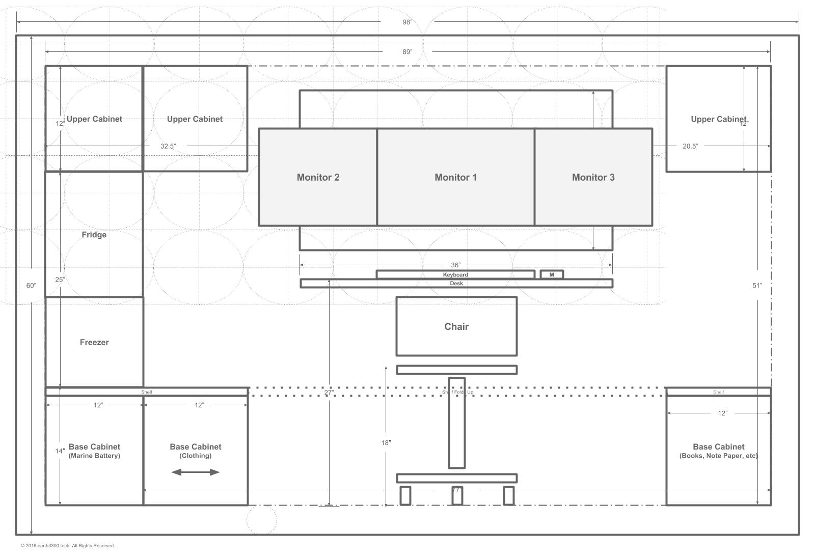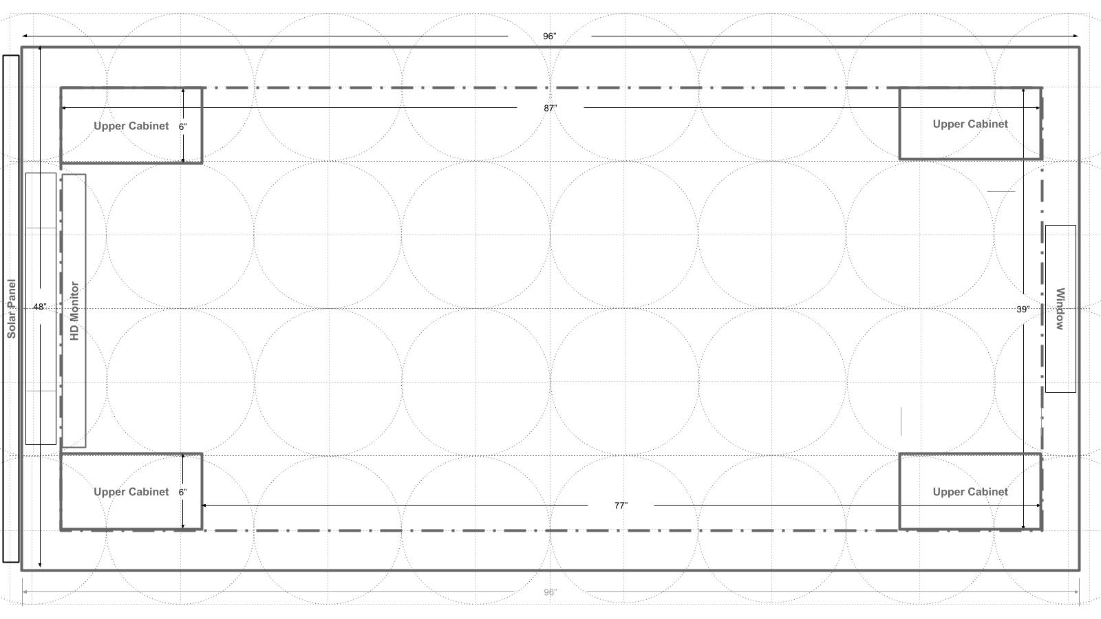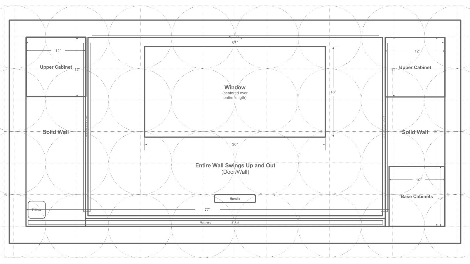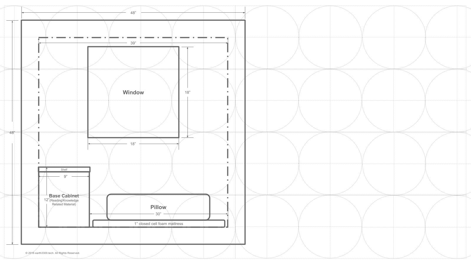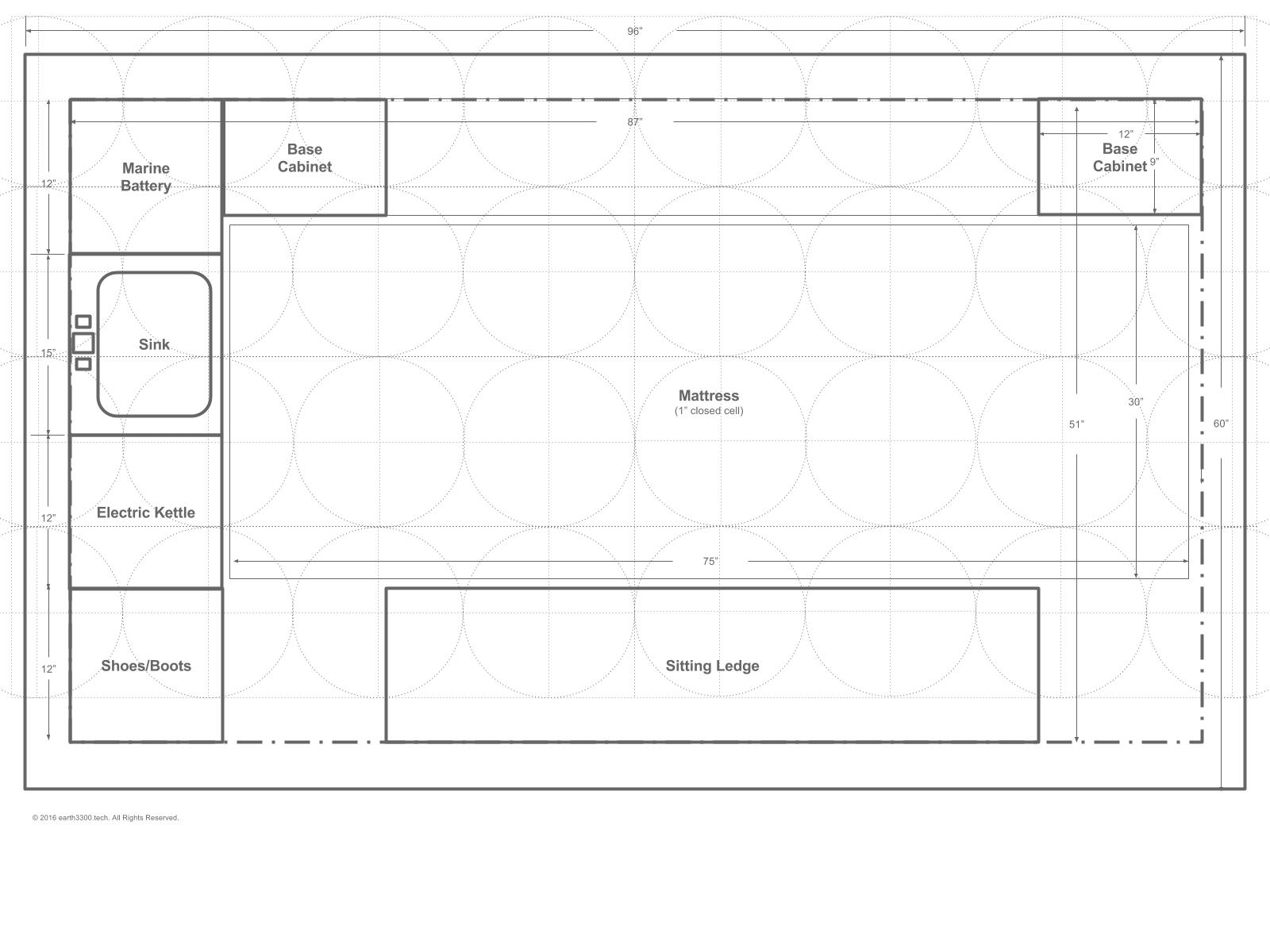 Here is a schematic of the floor plan after the initial one was designed. When talking through the initial plan it was realized that one would swing into the cabin and then want to remove boots or shoes when inside. These need to be stored somewhere. Also, to provide a degree of separation between the mattress area and the outside (to remove the mattress and sleeping bag or comforter from the outside elements), a "sitting ledge" would provide a nice transition point and allow the occupant to sit for a while on that ledge before getting up in the morning, or before settling down for the night.